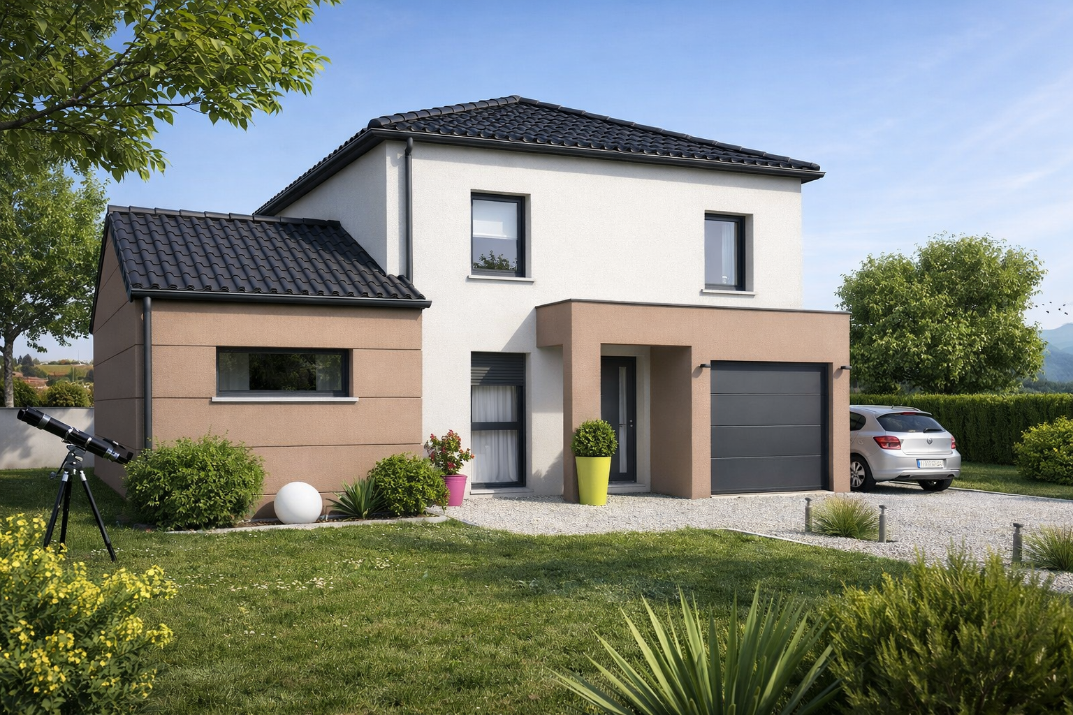 Avec son monopan en partie principale et son avancée de garage en toit plat, le modèle Méline a un look résolument contemporain. Bénéficiant d’une façade peu large, elle sera parfaite pour tous les terrains étroits.